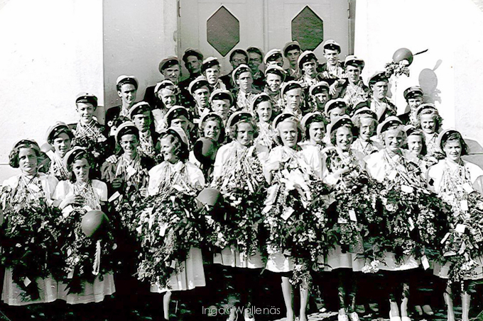 Festen med kamraterna hölls på Perssons Pensionat. Jag minns bara efterrätten. Det var hemgjord GLASS, himmelskt god. Det var inte ofta, man fick sådan glass. Vi blev bjudna en andra omgång. De första som blev bjudna tackade nej. Nästa och nästa tackade nej, ingen vågade bryta mönstret. Jag satt där och såg hur servitriserna trugade och trugade och undrade vad det var med ungdomarna - tyckte vi inte om glass? Dom närmade sig mig, och jag hoppades, att någon skulle våga säga ja tack, men inte! Inte heller jag vågade. Tänk om bara jag skulle sitta där och äta glass och bli uttittad av alla dom andra! Det var med tungt hjärta också jag ruskade på huvudet. Det gjorde också servitriserna, när dom gick ut med dom fulla skålarna.