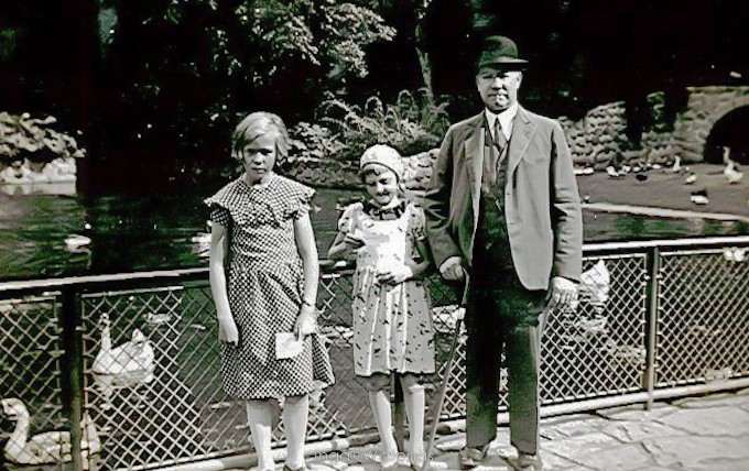 Av födelsedagsfirandet har jag suddiga minnesbilder, däremot minns jag, att Henny hade förevisning av mig på gården för hennes kamrater. Det kändes inte riktigt bra, dom var lite retsamma, och jag förstod inte varför. Annars var ju allting med en storstad nytt och märkvärdigt, t ex neonljus. En kväll när vi var ute och gick, blev min blå basker lila av det röda ljuset. Jag måste ta av den och vända och vrida på den och se hur den färgades lila. Vi var ute och promenerade i parker med vackra blommor och dammar med svanar och fontäner.
